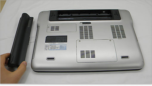 バッテリーの着脱をロックしているラッチ。その下にはシステムモデル名の印字。