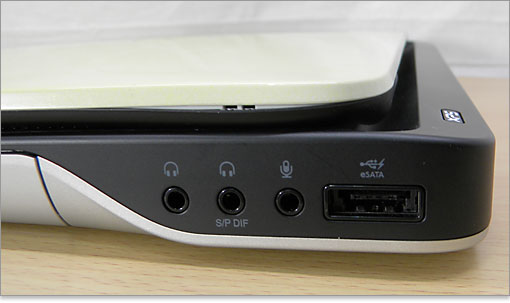 この面のUSB2.0(eSATA共有)は、PowerShare USB仕様なので、Windowsを立ち上げなくてもUSB経由の充電が可能です。バッテリーおよびACアダプタが接続されていれば、常に電源供給ができるので、MP3プレイヤーやケータイ電話の充電が非常に便利です。バッテリーの蓄電から充電している場合、バッテリー残量10%以下になると強制的にシャットオフされます。