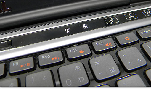 そして、「Windowsモビリティ、インスタント起動、オーディオコントロール」のタッチセンサー式操作パネルです。触れるとLEDライトで点灯します。