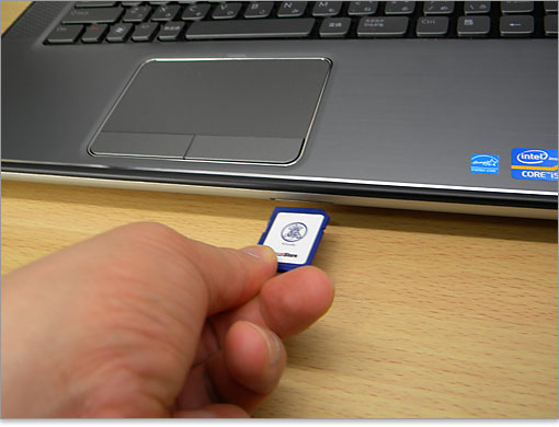 9規格対応カードスロットをXPS 15(L502X)の前面に装備しているので、扱いやすいです。新たにSDXCメモリカードにも対応しています。SDXCメモリカードは、SDHC(最大32GB)を超える大容量SDカードです。SDXCでは48GB以上のメモリカードがあり、今後、HD動画を撮影するユーザーには必須となるメディアですね。