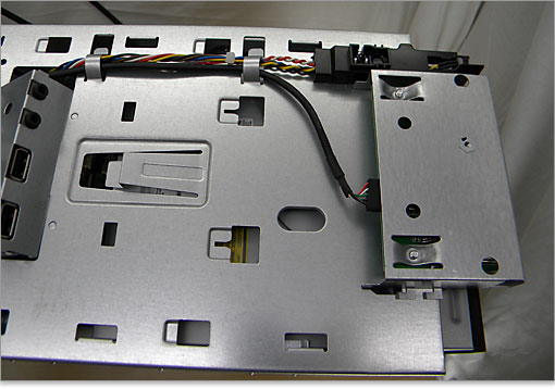 XPS 8300のフロントパネルおよび天井パネルを外した様子。XPS 8300のスチールボディを詳しく見ていきます。メディアトレイ用のUSB端子ユニットと、メディアカードスロットのユニット部分などが中心。