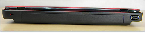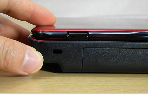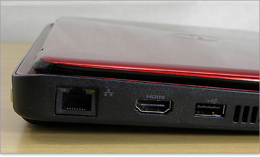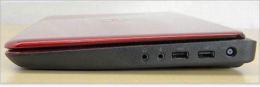Inspiron M102zの側面を詳しくみていきます。まずは右側面から。CULVノートのため、光学ドライブは搭載しません。Inspiron M102z右側面では、ヘッドフォン/マイク端子、USB2.0 × 2つ、電源コネクタを装備。