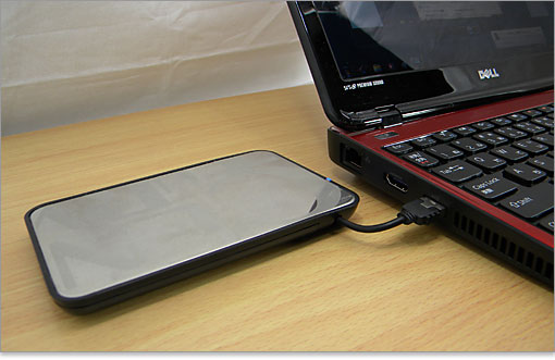 稲妻マーク入りのUSB端子はPowerShare USB対応。PowerShare USBなので電源を入れなくてもバッテリーおよびACアダプタ接続してあれば、USB経由で周辺機器の充電が可能です。パソコンを使う予定がなくてもMP3プレイヤーなどを気軽に充電できます。