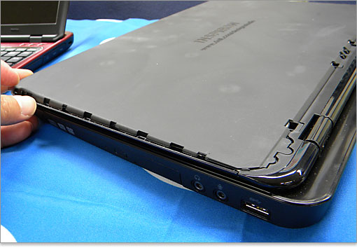 今回レビューしているInspiron 15R(N5110)は着せ替えできないタイプ(ピーコック・ブルー)ですが、イベントで着せ替えできるブラックモデルを見てきました。
