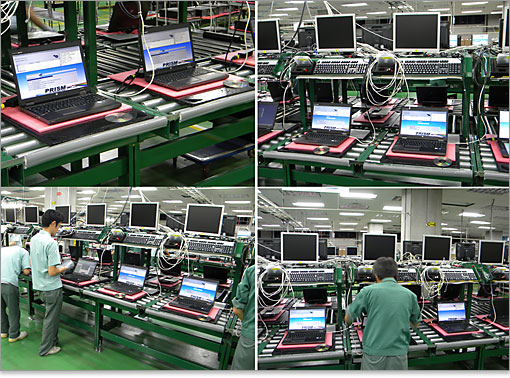黒いトレイにPCが1台ずつ載せられ、流れ作業です。ちゃんと静電気防止の手袋をしていますね。