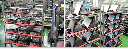 PC生産ラインの工程は、「アッセンブリー⇒プリテスト⇒ラン イン⇒ソフトウェアインストール⇒梱包⇒抜き取り検査」。これを2シフト体制で昼夜切れ目なく生産。