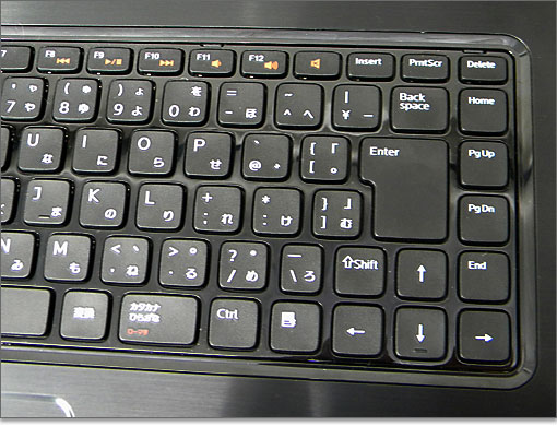 右半分。DELLでは標準となりつつある、2列目配置のEnterキー。右Shiftが小ぶりなのは、好みが分かれそう。”ろ”のキーが小ぶり。