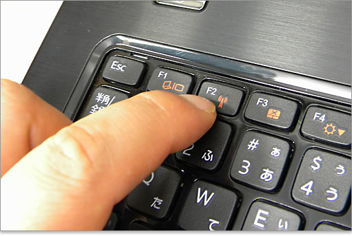 ESCキーから右へ「ディスプレイ切り替え、ワイヤレスON/OFF、、タッチパッド機能ON/OFF、、画面輝度のアップとダウン」の操作キー。