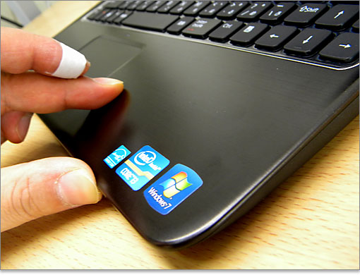 Inspiron 13z(N311z)のパームレスト部分。落ち着いた半光沢で金属表面。ブランドシールが貼付されています。
