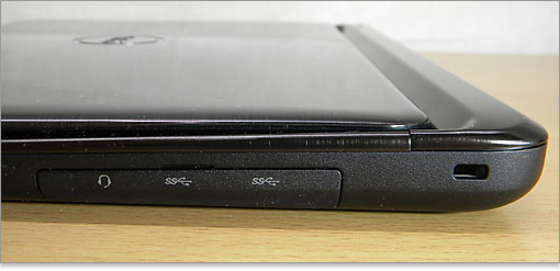 Inspiron 13z(N311z)の右側面。キャップを開けると、ヘッドフォン/マイク共用端子、そして高速インターフェースのUSB3.0を2つを装備。奥にはセキュリティケーブルスロット。