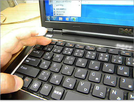 電源ボタン。Inspiron 14z(N411z)は比較的安価ですので、細かい造りが簡素ではないかと懸念されがちですが、特に安っちい印象はありません。電源ボタンでは、起動中に電源マークがLEDで点灯します。ボタンサイズもちょうどいい。