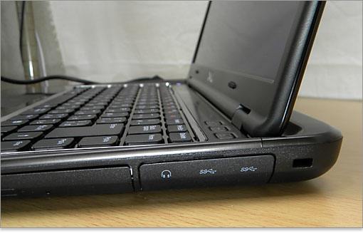 この面にInspiron 14z(N411z)の主要ポイントであるUSB3.0端子が装備されていますが、ソフトキャップで防塵カバーされています。奥にはセキュリティケーブルスロット。
