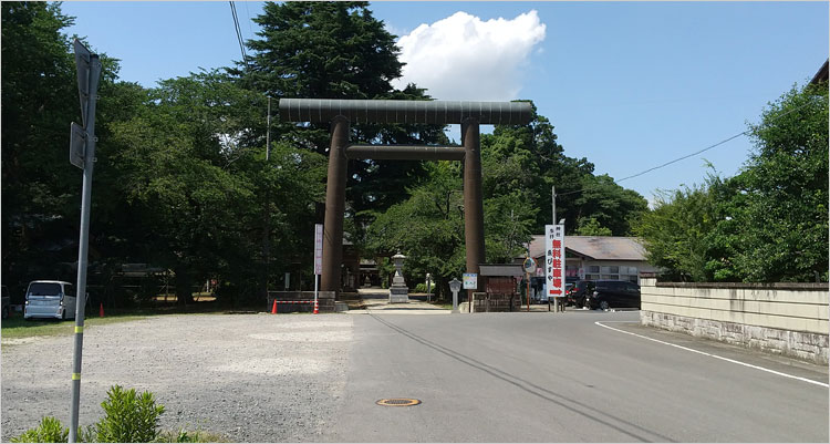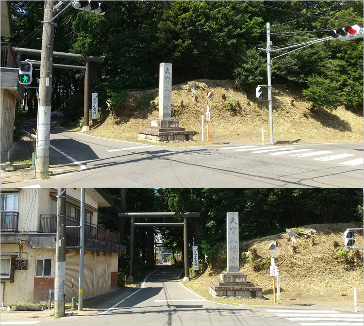 335線沿いの大宝八幡宮鳥居。城の南端でありここが大手虎口らしく土塁が確認できる。