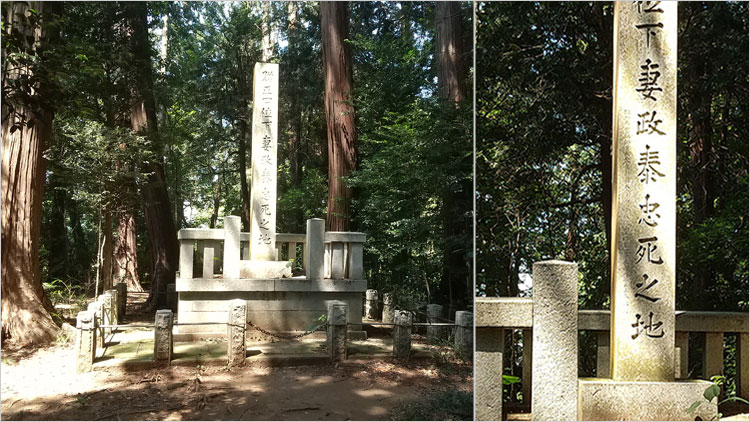 八幡宮裏の茂みには、昭和6年(1931)5月建立の『贈正四位下妻政泰忠死之地』の碑