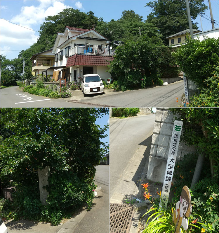 大宝城駅から東へ大宝八幡宮の高台に上る坂道。国指定史跡大宝城跡の標柱が建てられている。ここは位置的に本丸と二の郭の間にある堀切かと思われる。※日本城郭大系では堀切とは書かれていないが、上記の城郭図にはそう見えるので仮定した