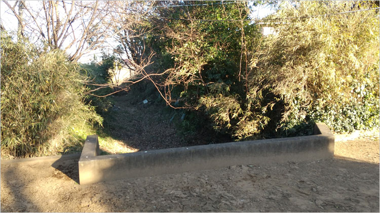甘棠院史跡公園側から撮った「西の堀」。埋もれて大分浅くはなっているが、館にしては規模が大きいとわかる。