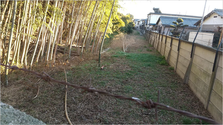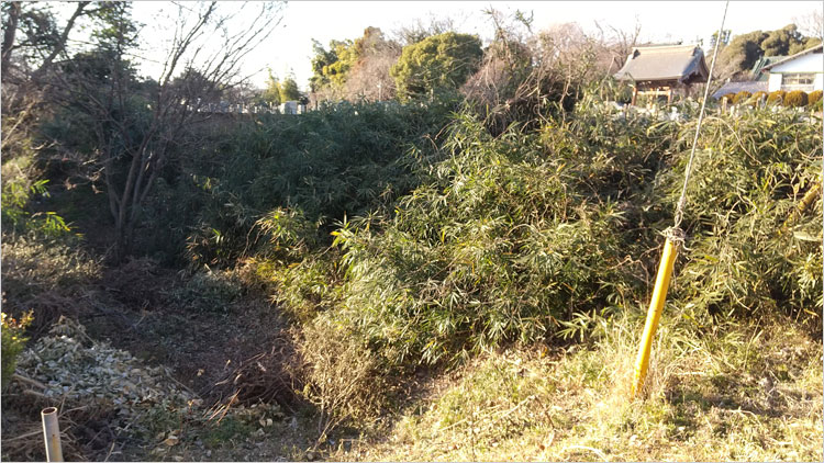 墓地から撮った「西の堀」。竹が密集しており規模が確認できない。