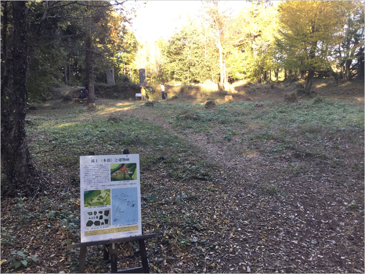 郭1(本郭)。虎口の造り、土塁の規模、そしてすべての城道がこの郭に集まっていることから、ここが本丸跡と考えられる。中央部には3~4棟以上の建物があったことが判明している。本郭からは白磁・染付・瀬戸美濃製品が出土している。