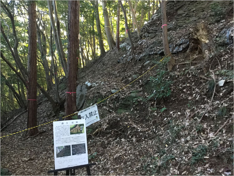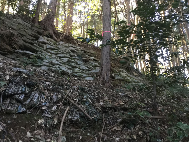 切岸面に積まれた緑泥石片岩。板状に割れる特徴を活かして長辺を正面に配置した積み方になっている。ここから1kmほど西に下里・青山板碑製作遺跡があり、板碑の石工と何らかの関係があったことは推測できる。
