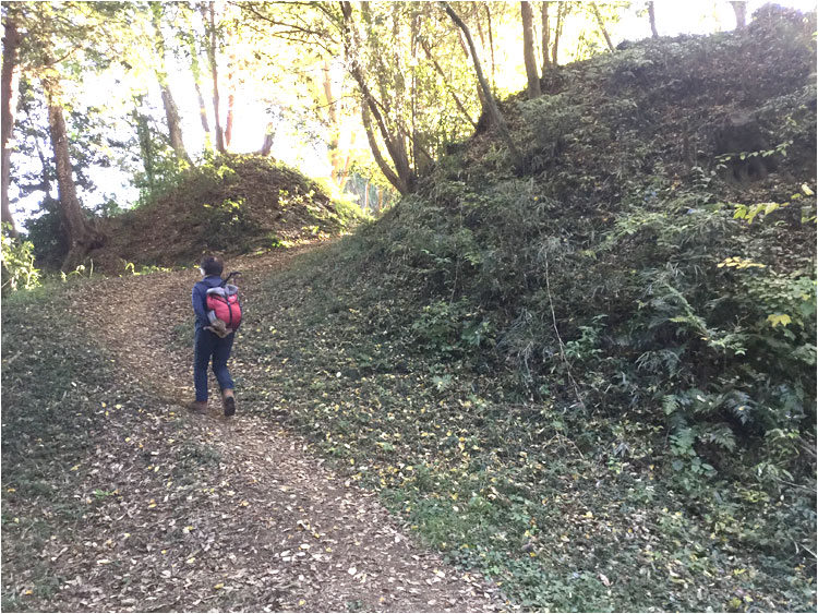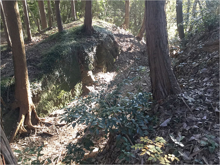 郭3の北部にある切り通し。岩盤を削って幅5m、最大の高さ3mの切通しになっている。削ったときに産出された石材は小倉城のどこかの石垣に使われているのだろう。