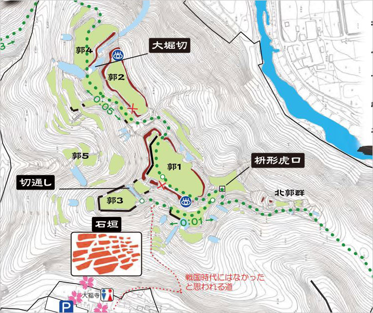 郭3から下っていくと大福寺に出る(ただし戦国時代にはなかった城道とされる)。大福寺の平場は城主の居館跡と考えられ、現在は田んぼだが溝堀跡も確認されている。