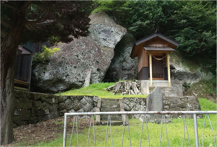 昔「今泉の舘山」には頭が3つある大蛇が居て村人を困らせていた。弘法大師がやって来て名主の家で大蛇の話を聞くと、神社に参り大岩を金の五鈷で打ちつけた。大岩が物凄い音をたて二つに割れ、大蛇がとびだし、天へ向かって昇り消えた。大蛇は大石になって今も神社の庭にある、という昔話が伝わっている。