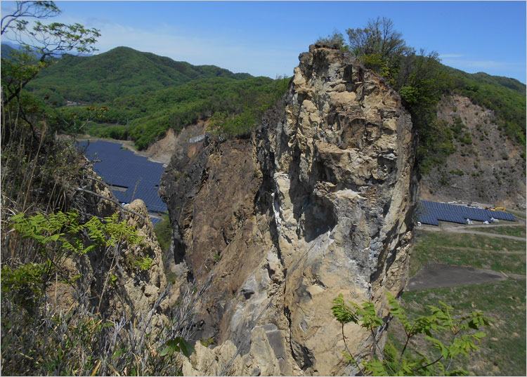 中腹(西側)から切り立った崖を眺めることができる。ここも採石場跡。