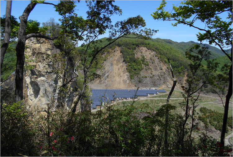 北側の採石場跡。低地にはソーラーパネルの設置。