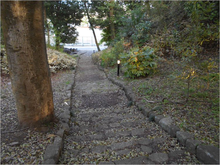 石畳通路と石垣が発見されている。現在は埋め戻しているので、この付近で出土した石を並べているとのこと。