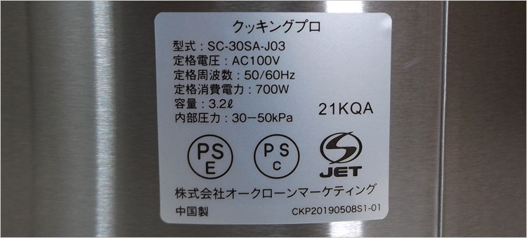 その下にはクッキングプロの仕様ラベル。形式はSC-30SA-J03。50/60Hzのインバーター仕様なので日本全国で使える。定格消費電力は700W、内部圧力:30-50kPa。日本規格Sマークを取得しており安全性認証済み。