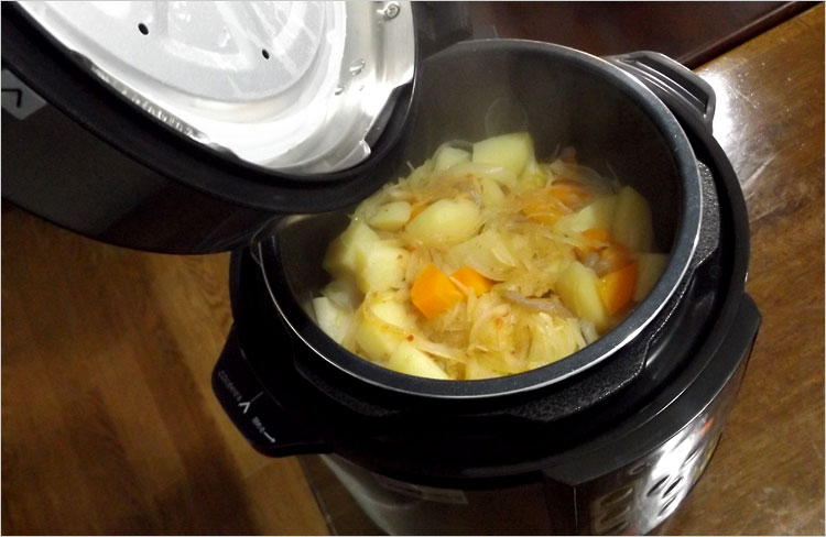 バルブをちゃんと真っ直ぐにして今度は「シチュー/スープ、加圧1分」でやり直し。すでに熱が入っているので1分もしないうちにピンが上がり加圧サインとなった(予熱が速攻完了)。蒸気はもう出ず、非常に静かな調理となった・・。