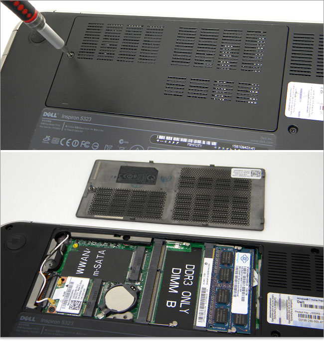 小窓の裏カバーを外してみましょう。DDR3メモリスロット2基とm-SATAスロット、ワイヤレスLANカードにアクセスできます。m-SATAスロットを装備していますが、2012年7月時点ではmSATA-SSDの搭載項目はありません。よってインテル スマート・レスポンス・テクノロジー(ISRT)にはDELLがサポートしていません。