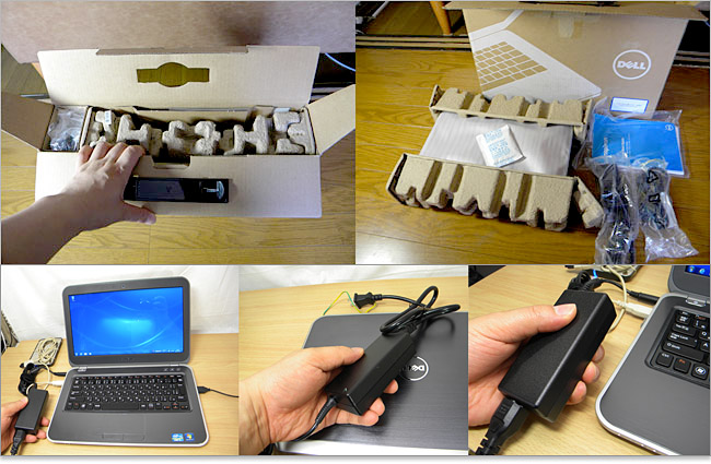 緩衝材にはパルプ材を使ったエコな梱包。65WのACアダプタと電源コンセントが同梱されています。マニュアルはペラ一枚のクイックガイドだけなので詳細マニュアルはDELLサイトでダウンロードです。梱包状態は2012年7月時点であり、その後の変更等があるかもしれません。当サイトでは情報保証していませんのであしからず。