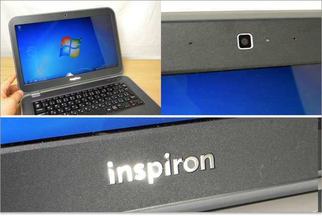 14インチ光沢液晶搭載なので、据え置きで自宅使用でも充分いけるサイズ。モバイルでは大画面ということになります。上部に100万画素Webカメラを内蔵、下部にはメッキ加工のInspironロゴがあります。普通、ディスプレイベゼルにはキーボードとの摩擦防止に棒状の緩衝ゴムがついているのですが、Inspiron 14z Ultrabookには見た目の悪い棒状のゴムは付いていません。ディスプレイ周りのエッジ部分が緩衝素材になっており、デザイン性を向上させています。