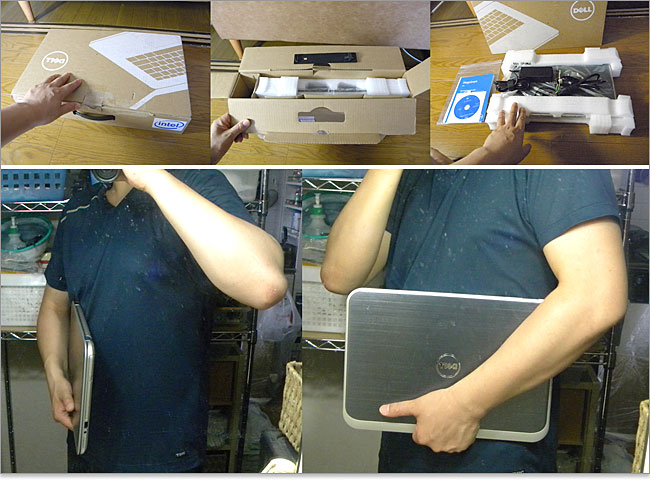 Inspiron 14z Ultrabookの梱包状態と、持ち抱えた時の写真。天板面積はほとんどスタンダードノート並ですが、とっても薄型なので、カバンには収納しやすいですね。