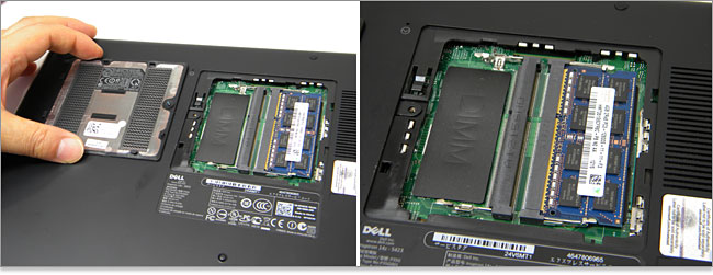 DDR3メモリスロットにアクセスするのは簡単。2スロット装備しています。6セルバッテリーは内蔵タイプなので取り外しが手間であり、そのままだとメモリスロットのアクセスがちょっと怖いですね。静電気防止グッズが必須となるでしょう。なお、バッテリー駆動時間はDELLサイトでは最大 7 時間 31 分と掲載されています。