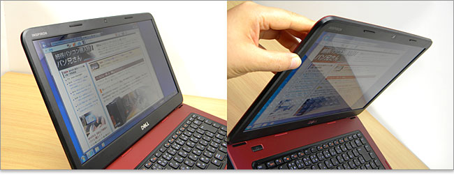 Inspiron 15は、15.6インチ光沢液晶画面。解像度は15インチクラスで一般的な1366x768。光沢液晶なので白黒のメリハリがありますが、照明の強いところでは映り込みのデメリットがあります。場所によっては画面の角度調整が必要となるでしょう。