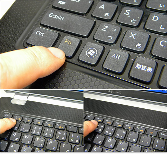 ファンクションキーと共用のキー「オレンジ印字のキー」はFnキーと同時押しで使います。初期設定ではファンクションキーが優先されていますが、BIOSやWinodwsモビリティセンターから優先キーを変更することができます。