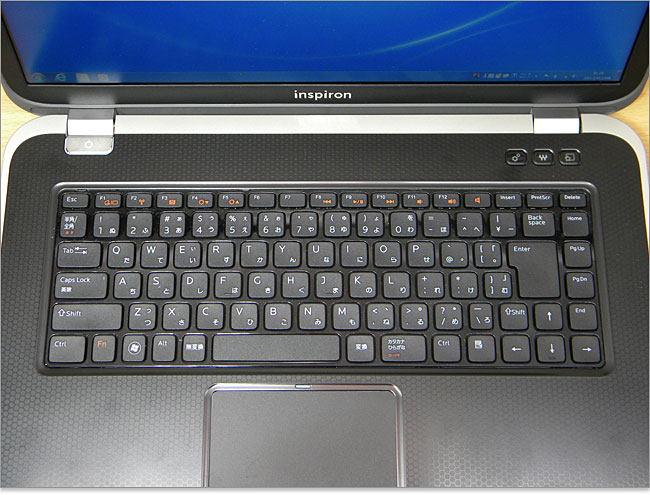 まずはInspiron 15R Special Editionのキーボードとその周りの様子。オプションでバックライトキーボードにすることができます。