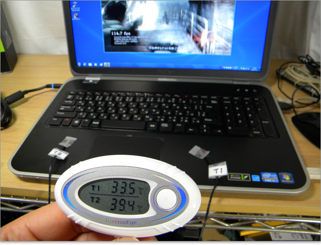 散々ベンチマークテストを1時間ほど行ってから、パームレストの発熱温度を測定。とくに左側が熱くなっていますが、ここはHDDが内蔵されているあたりですね。室内気温、30度。結構汗だくな環境下です。