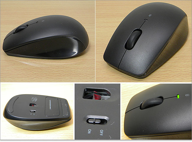 光学マウスが採用されていおり、多機能マウスではなくシンプル機能です。てっぺんはマットブラックで、側面は光沢ブラック。スクロールホイールは滑り止めのラバーコーティングがされています。