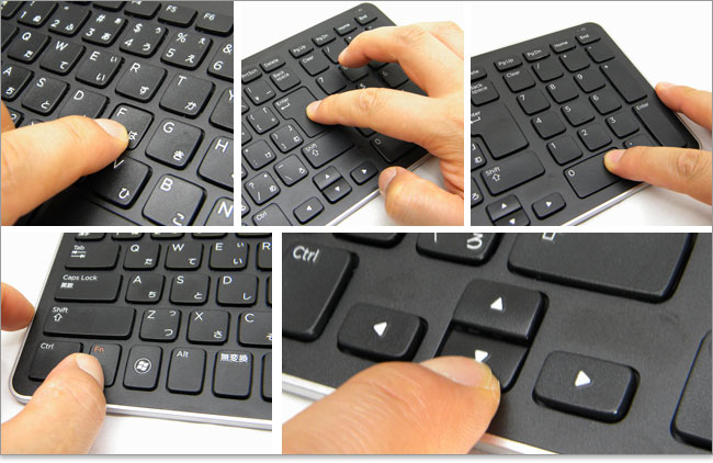 Deleteキーの位置などが独特。ノートパソコンのキータッチと同様。押下はアイソレーション・キーボード相応ですが、程よい押し応え。