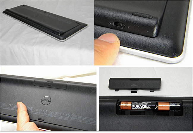 DELLワイヤレスキーボードの背面にある隆起部分に、単4電池2本がセットされています。電池の消耗を避けるためにオンオフ・スイッチがあります。底面はポリカーボネート素材です。中央にDELLロゴ。