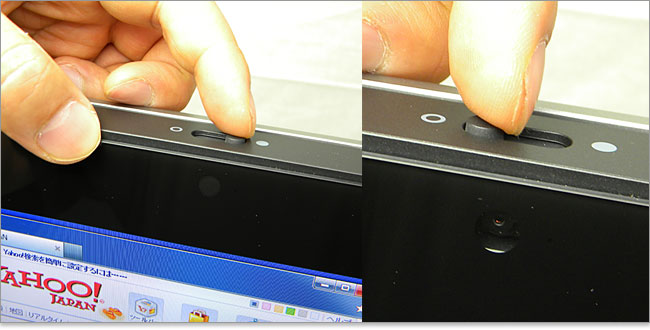 天井にカバーラッチを配置。ラッチをスライドすることで、カメラを塞ぐことができます。これの必要性がイマイチ理解できなかったのですが、テレビのニュースを見てから何となく理解しました。ウィルスに感染するとWebカメラが盗撮に使われる例があるようで、その安全対策用だと個人的に理解しています。