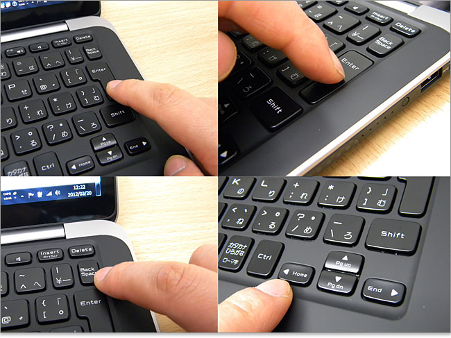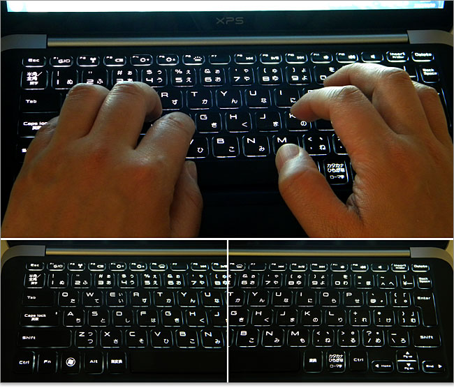 XPS 13 Ultrabookの本体が薄いせいなんでしょうが、キーストロークが浅く感じます。(通常のキーよりも半分くらいの印象。)ただ、手応えはしっかりあるので文句はありません。