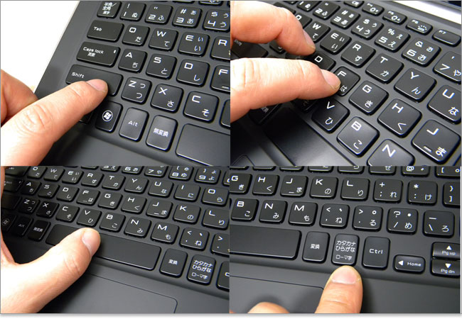 そのほかのメインキーを操作している様子。パソ兄さんのような指が太いユーザーでも浮石型キーは扱いやすい。もともとはネイルをばっちり決めたお姉さま向けに考案されたのでしょうけどね。