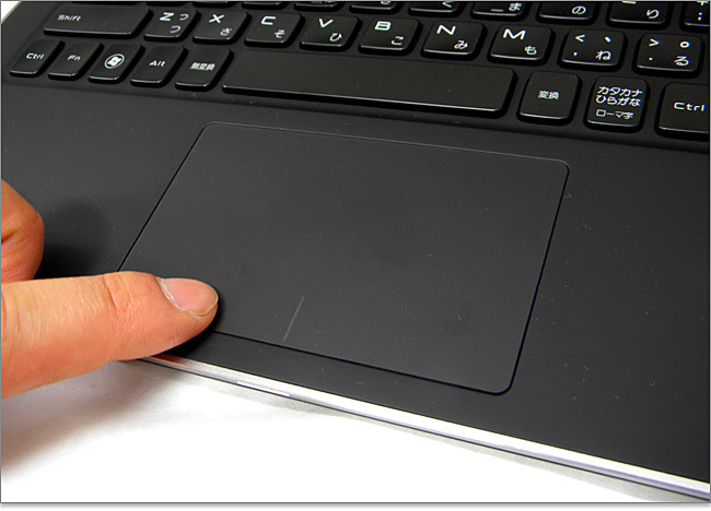 ボタン一体型のガラス製タッチパッド。中央下に一本ラインが引かれているので、それを目安にクリックボタンを操作します。クリックボタンが曖昧に見えるところから好き嫌いに別れるタイプでしょう。ガラス製とのことですが、実機を前にしてもそれを判断するのは難しいです。また、指の動きによって様々な操作をするジェスチャーサポート対応ですが、個人的にはうざったいので機能をオフにしています。